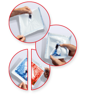 Cette version de test à encre se présente sous forme de flacons avec pipettes, devant être inséré dans un Système de Barrière Stérile préformé refermé ensuite, afin de permettre de vérifier l’intégralité des soudures (soudures industrielles et soudures réalisées en zone de conditionnement). Toute irrégularité est alors immédiatement détectée.